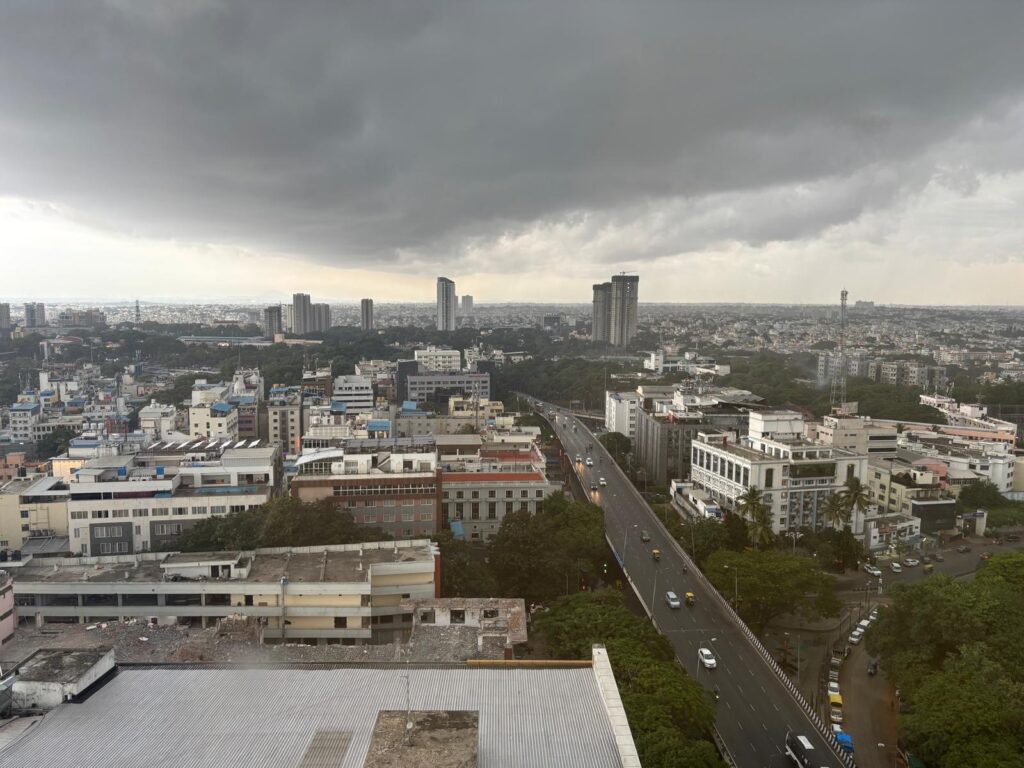 Bangalore es más bonita que el promedio del resto de megaurbes indias, lo cual tampoco es mucho decir. En la foto, tomada desde el Holiday Inn, se aprecia la tormenta que teníamos encima. Es que era época de monzones.